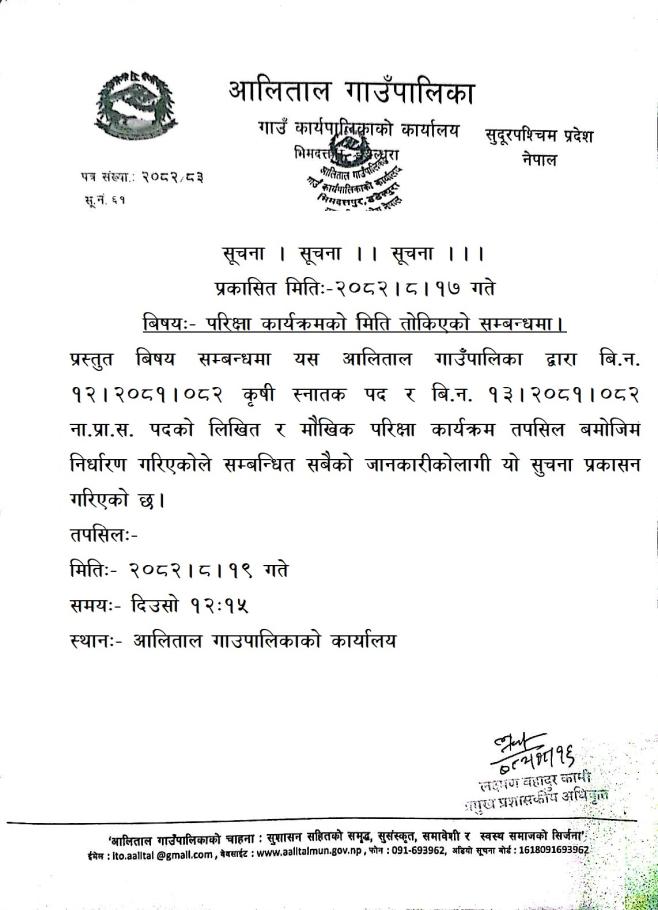 कृषि स्‍नातक र ना प्रा स पदको परिक्षा कार्यक्रम तोकिएको बारे