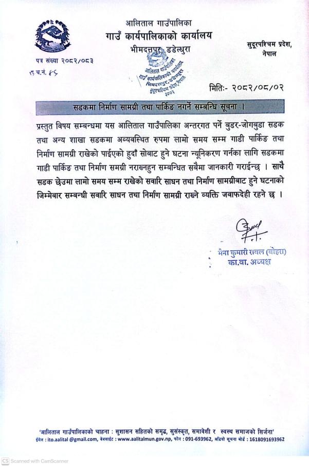 सडकमा निर्माण सामाग्री नराख्न तथा जथाभावी पार्किङ नगर्नु हुन अनुरोध छ।